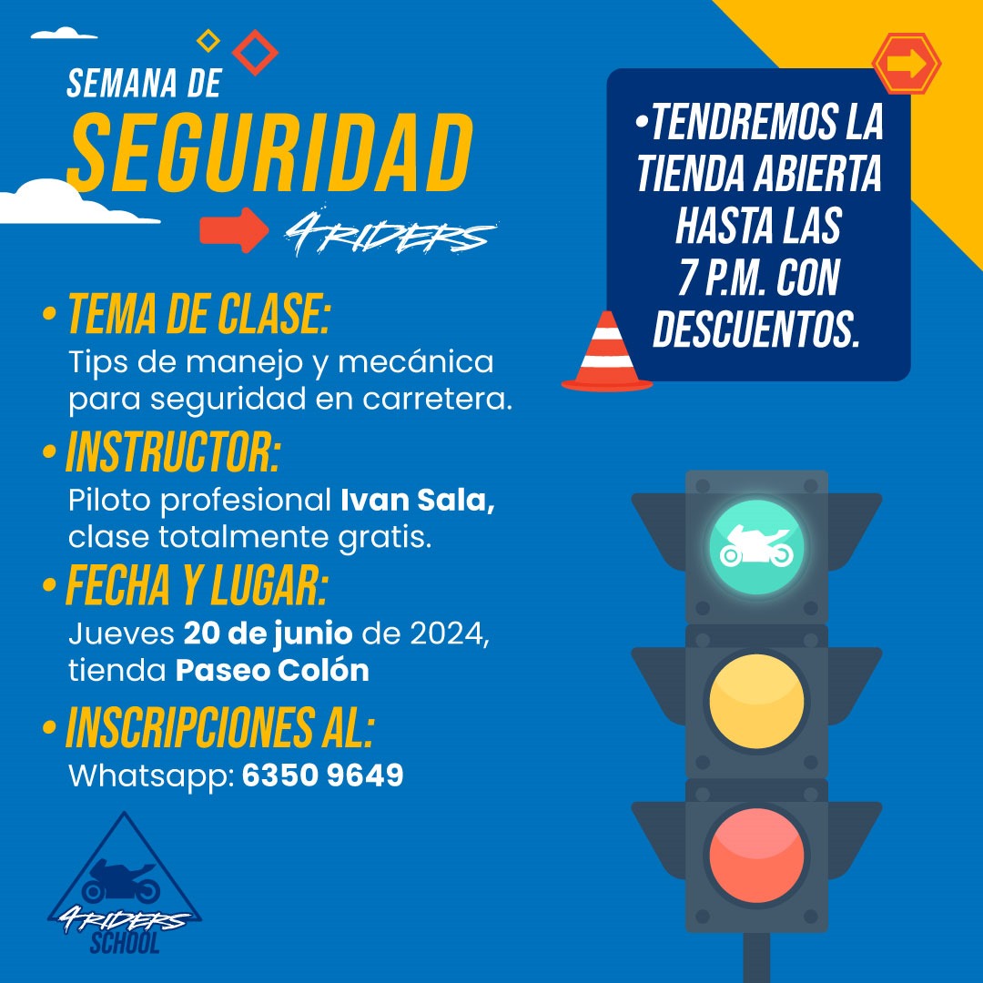 Para más información sobre equipamiento de seguridad y consejos para motociclistas, visite nuestras redes sociales 4Riders_cr o bien envíenos su consulta al whatsapp 6350-9649